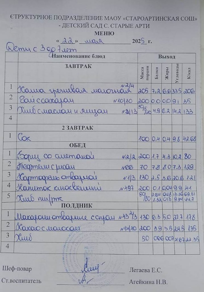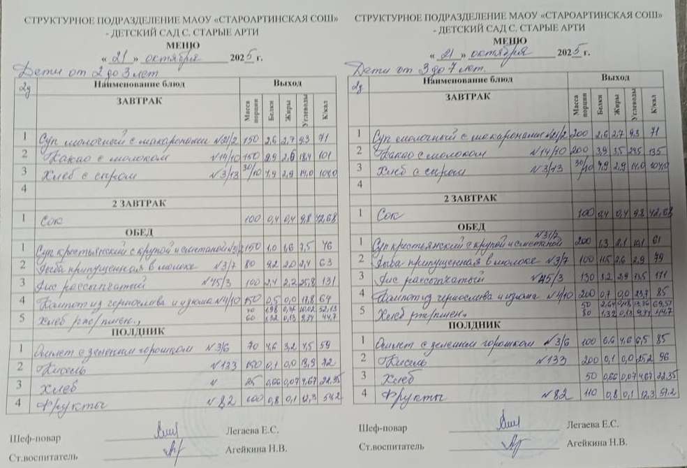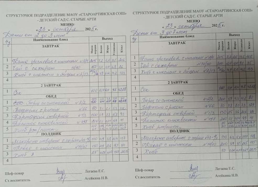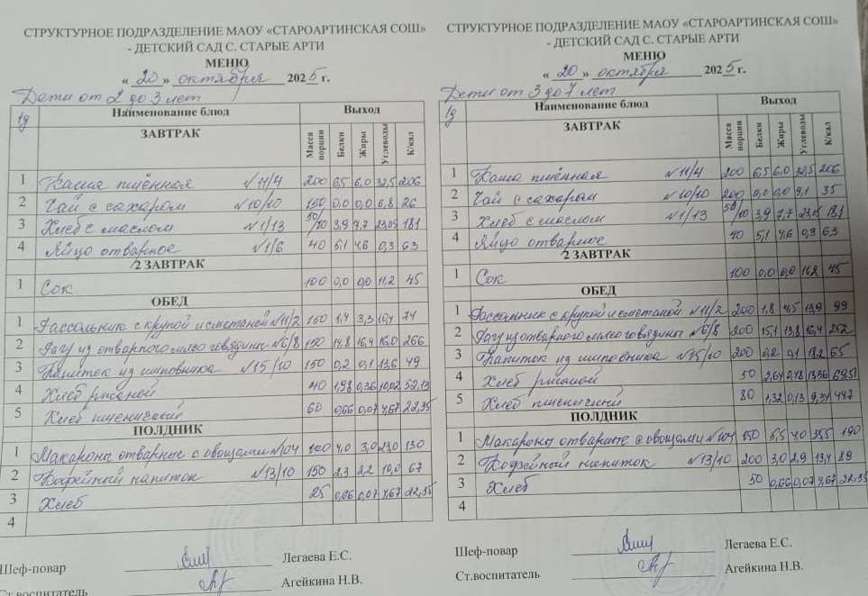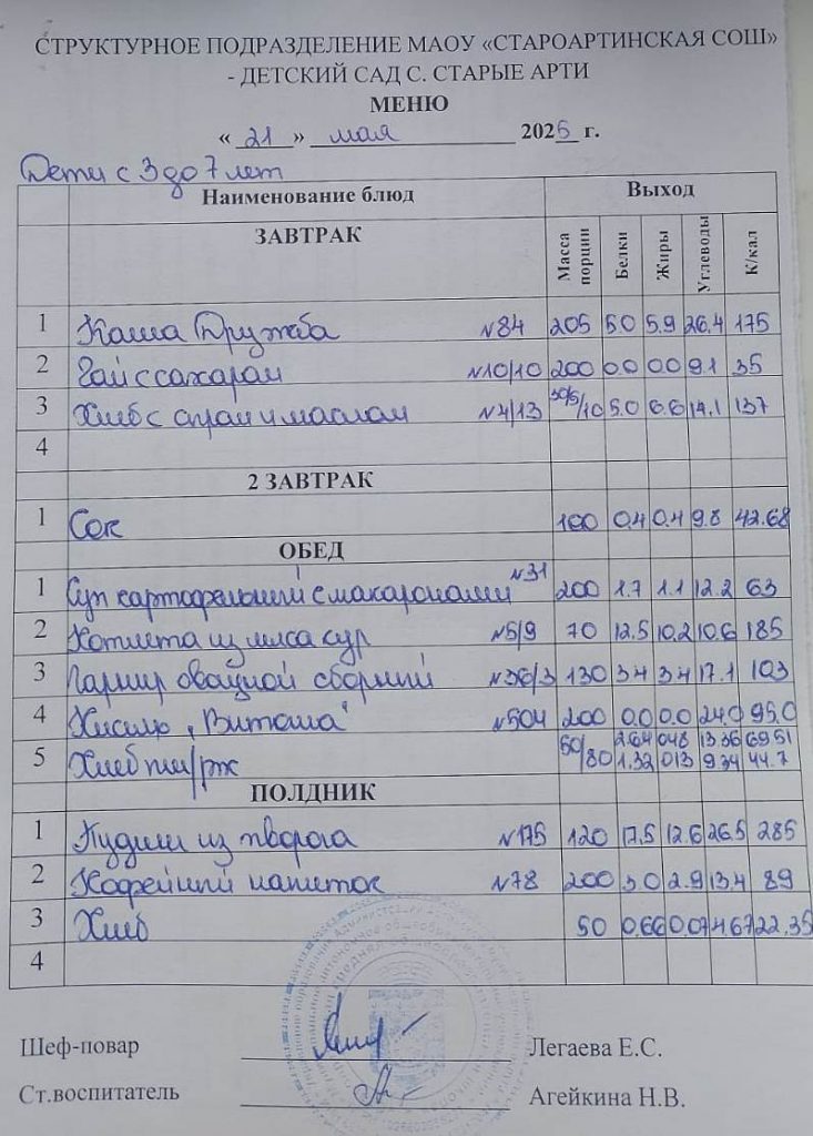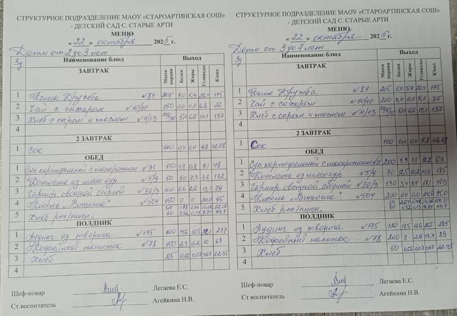 Меню детский сад Старые Арти
